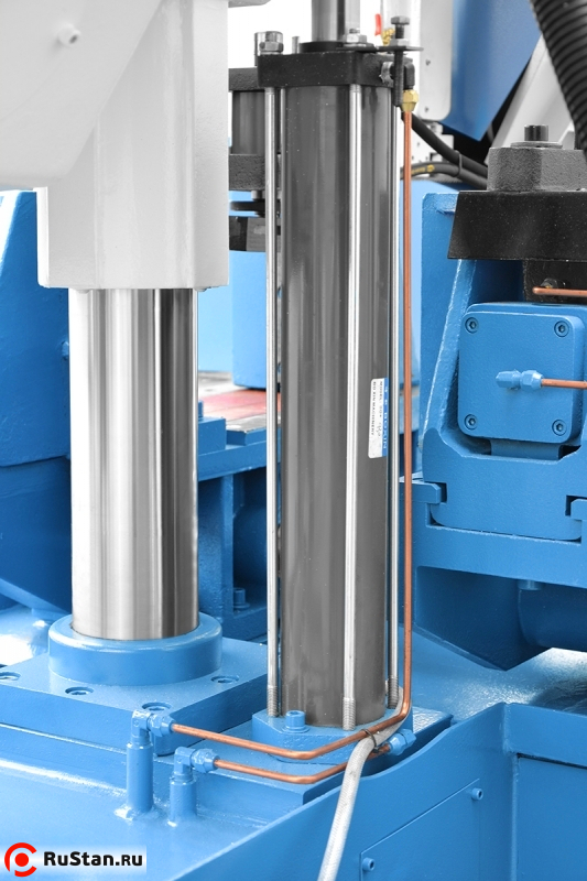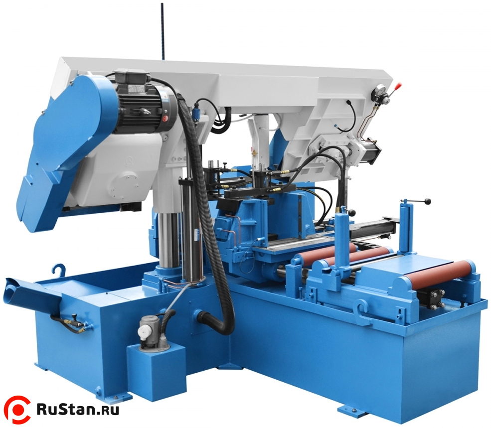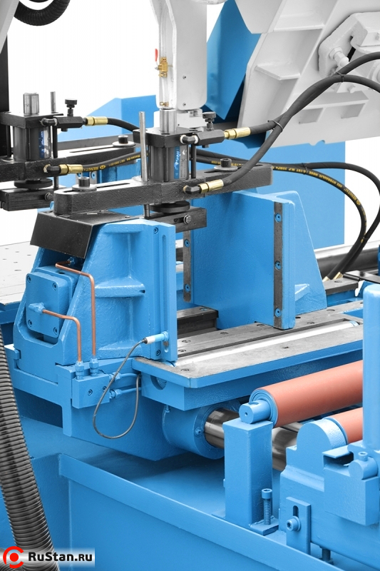 Ровный рез обеспечивают направляющие станка состоящие из подшипников твердосплавных направляющих. Максимальные параметры резки и более длительный срок службы ленточной пилы обеспечивают — обильное охлаждение и чистящие щётки. Принудительное гидравлическое опускание рамы регулируется в широком диапазоне с помощью дроссельного клапана. Система ускоренной подачи, позволяет максимально сократить время резки. Гидравлическая система подачи материала — позволяет автоматизировать цикл работы. Контроллер станка оснащён дисплеем LCD, с русским языком, что позволяет легко программировать: действия пилы, сигнализировать окончание работы, передавать сигналы ошибок и информировать о количестве разрезаных элементов во время запрограмированного времени. Максимальная длина подачи материала — 500 мм с точностью +/- 0,2 мм.